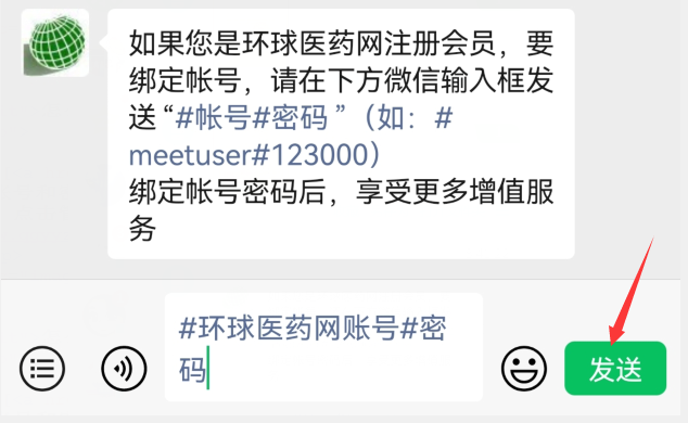 第三步:微信掃一掃此頁面的二維碼,跳轉(zhuǎn)到環(huán)球醫(yī)藥網(wǎng)的公眾號,根據(jù)提示,在微信輸入框里發(fā)送“#您的帳號#您的密碼”進(jìn)行綁定。
