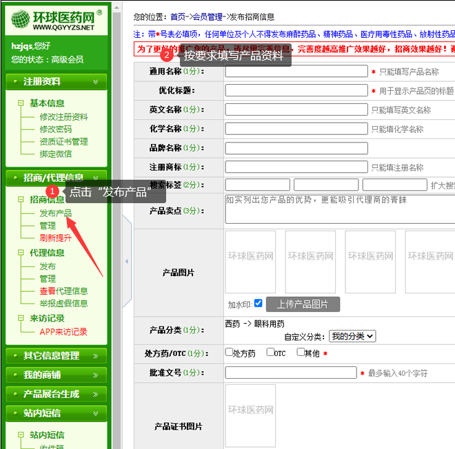 第二步:點(diǎn)擊管理后臺左側(cè)操作面板的“發(fā)布產(chǎn)品”進(jìn)行發(fā)布招商產(chǎn)品操作(請按要求填寫,否則不予審核)