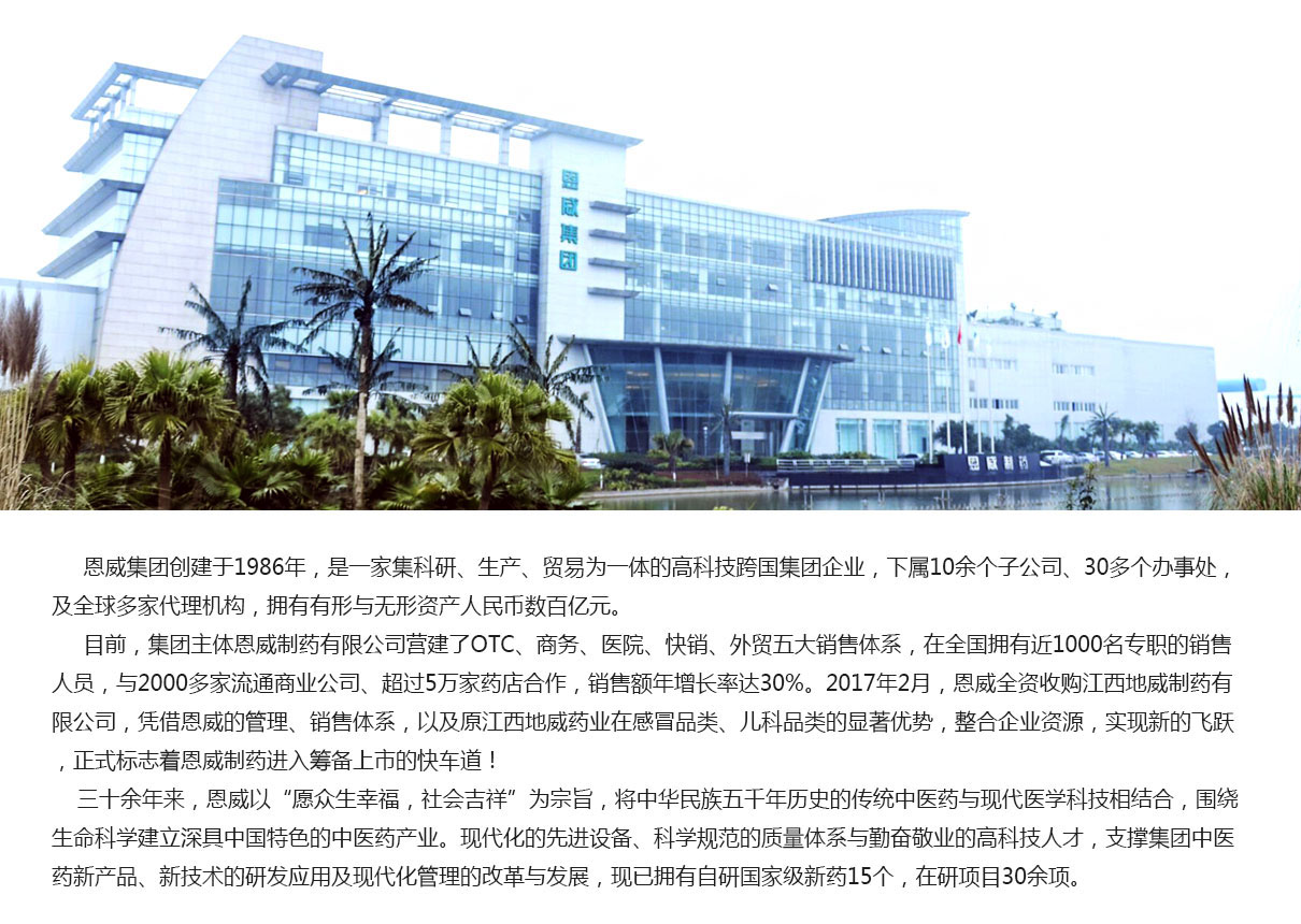 恩威集團(tuán)創(chuàng)建于1986年,是一家集科研、生產(chǎn)、貿(mào)易為一體的高科技跨國集團(tuán)企業(yè),下屬10余個(gè)子公司、30多個(gè)辦事處,及全球多家代理機(jī)構(gòu),擁有有形與無形資產(chǎn)人民幣數(shù)百億元。
