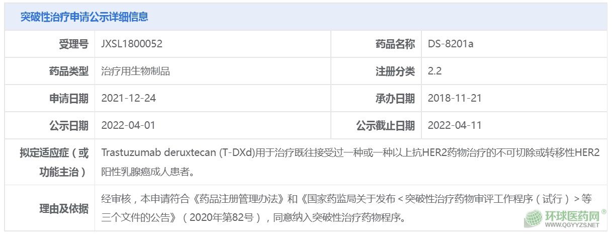 CDE官網(wǎng)最新顯示,第一三共ADC藥物Trastuzumab deruxtecan(T-DXd)擬納入突破性治…