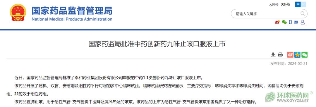 2024年2月21日,國(guó)家藥監(jiān)局消息,近日,國(guó)家藥監(jiān)局批準(zhǔn)1.1類創(chuàng)中藥創(chuàng)新藥九味 止咳 口服液 上市。 該藥…