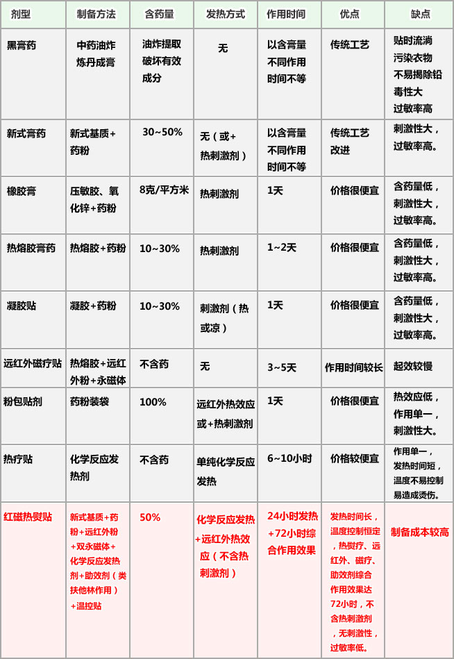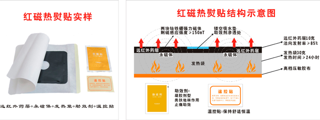 紅磁熱熨貼 2012年骨科新品 發(fā)明專利:201220168255.5 獨(dú)家原研外用貼劑 首次招商非貼牌套號產(chǎn)品 冀食藥監(jiān)械(準(zhǔn))字2012第2260076號 最適合藥品終端的高毛利器械產(chǎn)品 ◆熱熨療、磁療、遠(yuǎn)紅外療三重功效 ◆獨(dú)家發(fā)熱時間長達(dá)24小時 ◆獨(dú)創(chuàng)性配以助效劑,顯著提高效果 ◆綜合作用時間長達(dá)48-72小時 ◆權(quán)威臨床機(jī)構(gòu)驗證療效 ◆適用醫(yī)保收費(fèi)項目:紅外線治療、穴位貼敷、磁熱療法等 紅磁熱熨貼是依據(jù)中醫(yī)內(nèi)病外治理論和經(jīng)絡(luò)傳導(dǎo)治療原理而研制的一種新型外用熱熨產(chǎn)品,本品博采眾長,突破傳統(tǒng),將熱熨療與磁療及特定頻率遠(yuǎn)紅外治療相結(jié)合,并獨(dú)有助效劑與三重物理作用協(xié)同起效,四效合一,比市場類似產(chǎn)品作用時間更長,療效更顯著。本品幾分鐘起效,患者體驗后忠誠度極高,是非常適合OTC主推的高毛利外用產(chǎn)品。另不受藥品價格政策限制,不通過招標(biāo)可直接進(jìn)器械科按耗材收費(fèi)醫(yī)保報銷,是理療科,骨科,疼痛科外用貼劑的最佳選擇。 熱熨療 紅磁熱熨貼組方獨(dú)特,十分鐘起效,熱熨時間達(dá)到24小時,大大超過同類產(chǎn)品。溫?zé)嶂τ杀磉_(dá)里,循經(jīng)運(yùn)行,內(nèi)達(dá)臟腑,能疏通經(jīng)絡(luò),溫中散寒,暢通氣血,鎮(zhèn)痛消腫。熱熨效應(yīng)傳導(dǎo)至皮下15-20mm,病變部位溫度明顯超過其他部位,能使局部毛細(xì)血管擴(kuò)張并能促進(jìn)局部血液循環(huán),改善組織營養(yǎng)與新陳代謝,降低肌肉及結(jié)締組織張力,松解組織粘連、痙攣,消除炎癥和創(chuàng)傷的病理損害,加速組織生長修復(fù),迅速緩解患者臨床癥狀。 遠(yuǎn)紅外 紅磁熱熨貼采用波長5-16微米的遠(yuǎn)紅外,遠(yuǎn)紅外法向發(fā)射率≥85%,與人體內(nèi)細(xì)胞分子的振動頻率接近,遠(yuǎn)紅外線能滲入皮下組織3-5毫米,引起人體細(xì)胞的原子和分子的共振,分子之間摩擦生熱形成熱反應(yīng),促使皮下深層溫度上升,并使微血管擴(kuò)張,加速血液循環(huán),增強(qiáng)血管壁彈性,增加人體的供血供氧,有利于清除血管囤積物及體內(nèi)有害物質(zhì),將妨害新陳代謝的障礙清除,活血化瘀,鎮(zhèn)痛消炎,改善局部代謝,復(fù)活機(jī)能受損的病變組織。 磁療 紅磁熱熨貼含兩塊釹鐵硼強(qiáng)力磁體,剩磁感應(yīng)強(qiáng)度≥150mT,強(qiáng)力的磁場能改善血液循環(huán)和組織營養(yǎng),降低末梢神經(jīng)的興奮性,促使緩激肽、酸性代謝產(chǎn)物致痛物質(zhì)的分解和轉(zhuǎn)化,從而具有鎮(zhèn)痛作用;并可以加強(qiáng)患者局部的血液循環(huán),改善組織的通透性,有利于炎癥的消散和滲出物的吸收。同時,磁場還能提高機(jī)體的非特異性免疫功能,增強(qiáng)白血球吞噬機(jī)能,使紅血球和淋巴細(xì)胞的沉降變慢,有利于消炎和降低血沉,改變病人的全身狀態(tài),提高對疾病的抵抗能力,抑制和防止疾病的復(fù)發(fā)。 助效劑 本品獨(dú)創(chuàng)性的配以助效劑,延長發(fā)熱時間,促進(jìn)透皮吸收,可顯著提高治療效果。 臨床試驗資料 紅磁熱熨貼經(jīng)國家紅外及工業(yè)電熱產(chǎn)品質(zhì)量監(jiān)督檢驗中心、河北省醫(yī)療器械與藥包材檢驗所、山東省醫(yī)療器械產(chǎn)品質(zhì)量檢驗中心進(jìn)行質(zhì)量檢測,在河北醫(yī)科大學(xué)第三醫(yī)院及哈勵遜國際和平醫(yī)院臨床驗證,對頸椎病、肩周炎、腰椎間盤突出、頸肌纖維質(zhì)炎、腰肌纖維質(zhì)炎、滑膜炎、網(wǎng)球肘、退行性膝關(guān)節(jié)病等引起的頸、肩、腰、四肢等肌肉關(guān)節(jié)部位的疼痛、麻木、腫脹、屈伸不利等,均有很好的治療效果,試驗期間未發(fā)現(xiàn)明顯不良反應(yīng)。 河北醫(yī)科大學(xué)第三醫(yī)院臨床試驗資料 河北醫(yī)科大學(xué)第三醫(yī)院根據(jù)臨床試驗方案,選擇來自中醫(yī)科、骨科或中醫(yī)針灸科的骨關(guān)節(jié)病患者120例,頸肌纖維質(zhì)炎20例,肩周炎24例,腰肌纖維質(zhì)炎40例,腰間盤突出8例,膝關(guān)節(jié)炎16例,滑膜炎6例,網(wǎng)球肘6例,風(fēng)濕類風(fēng)濕關(guān)節(jié)炎6例。男72例,女48例。平均年齡52.4±7.92歲。最長病程790天,最短病程1天,平均病程56±8.65天。所有病例均符合頸、肩、腰、四肢關(guān)節(jié)肌肉部位的痛、麻、腫、曲伸不利等臨床癥狀診斷,且符合入選標(biāo)準(zhǔn)及排除標(biāo)準(zhǔn)。試驗結(jié)果:臨床治愈54例,占45%,顯效43例,占36%,有效20例,占16%,無效3例,占3%。總有效率97%,明顯高于對照組。 哈勵遜國際和平醫(yī)院臨床試驗資料 哈勵遜國際和平醫(yī)院根據(jù)臨床試驗方案,試驗組選擇120例骨關(guān)節(jié)病患者中,頸椎病12例,肩周炎4例,腰肌纖維質(zhì)炎20例,腰間盤突出16例,關(guān)節(jié)炎36例,滑膜炎4例,退行性膝關(guān)節(jié)病變20例,風(fēng)濕類風(fēng)濕關(guān)節(jié)炎8例。男56例,女64例。年齡最大72歲,最小26歲,平均年齡53.6±11.57歲。最長病程90天,最短病程2天,平均病程31.1±22.86天。試驗結(jié)果:臨床治愈50例,占41.6%,顯效35例,占29.3%,有效31例,占25.8%,無效4例,占3.3%。總有效率96.7%。