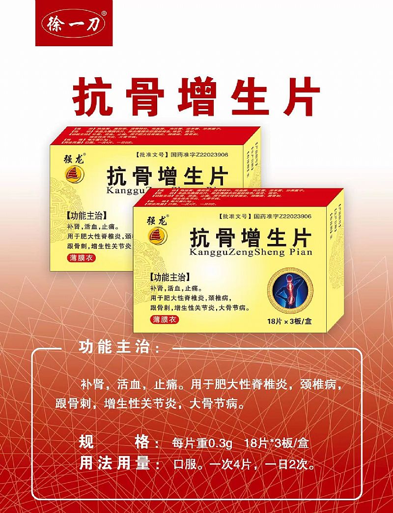| 功能主治 | 補腎,活血,止痛。用于肥大性脊椎炎,頸椎病,跟骨刺,增生性關節(jié)炎,大骨節(jié)病。 |
