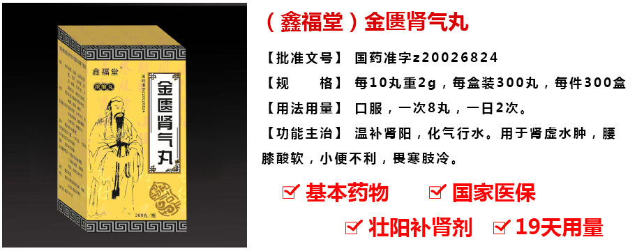 | 【功能主治】 | 溫補(bǔ)腎陽(yáng),化氣行水。用于腎虛水腫,腰膝酸軟,小便不利,畏寒肢冷。 |