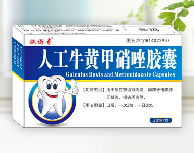 | 【功能主治】 | 人工牛黃甲硝唑膠囊為復(fù)方制劑,其組分為每粒含:甲硝唑200mg,含人工牛黃5mg的膠囊劑,內(nèi)容物為黃色或微黃色顆;蚍勰。 作用/功效:本品用于急性智齒冠周炎、局部牙槽膿腫、牙髓炎、根尖周炎等。 : 1.本品嚴(yán)重不良反應(yīng)為高劑量時可引起癲癇發(fā)作和周圍神經(jīng)病變,后者主要表現(xiàn)為肢端麻木和感覺異常。某些病例長期用藥時可產(chǎn)生持續(xù)性周圍神經(jīng)病變;2.其他常見的不良反應(yīng)有: (1)胃腸道反應(yīng),如惡心、食欲減退、嘔吐、腹瀉、腹部不適、味覺改變、口干、口腔金屬味等; (2)可逆性粒細(xì)胞減少; (3)過敏反應(yīng),皮疹、蕁麻疹、瘙癢等; (4)中樞神經(jīng)系統(tǒng)癥狀,如頭痛、眩暈、暈厥、感覺異常、肢體麻木、共濟(jì)失調(diào)和精神錯亂等; (5)其他有發(fā)熱、陰道念珠菌感染、膀胱炎、排尿困難、尿液顏色發(fā)黑等,均屬可逆性,停藥后自行恢復(fù)。 |