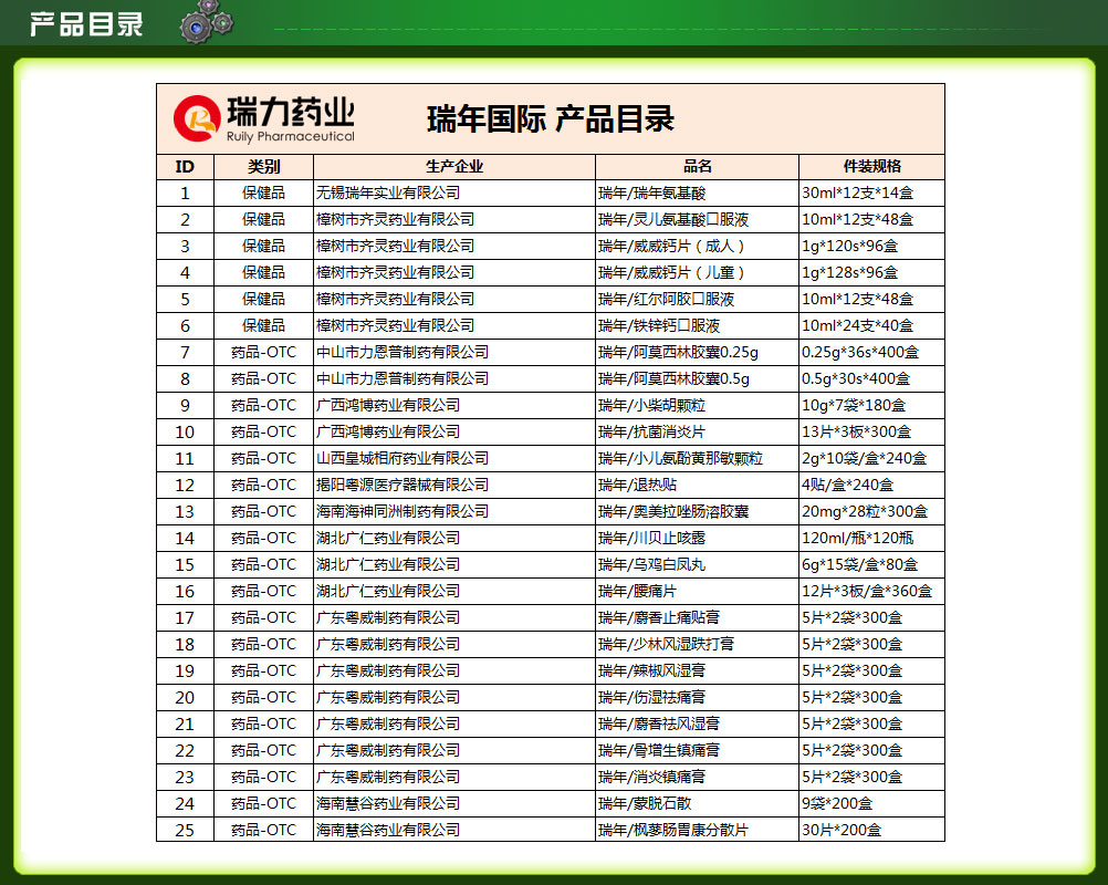 廣東瑞力藥業(yè)有限公司產(chǎn)品展示列表, 技術(shù)支持:環(huán)球醫(yī)藥招商網(wǎng) (招商頻道-醫(yī)藥代理-otc-處方藥) 版權(quán)所有,違版必究