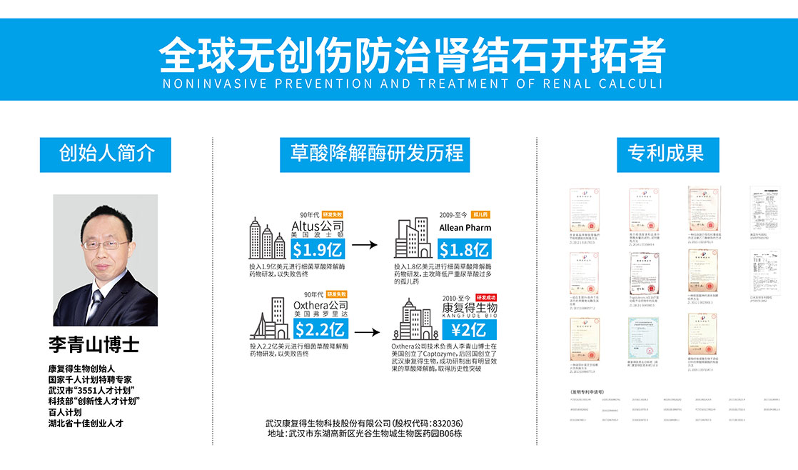 康復(fù)得生物致力于利用中美兩國(guó)資源,持續(xù)不斷地進(jìn)行創(chuàng)新,為腎結(jié)石患者提供優(yōu)質(zhì)的腎健康管理服務(wù),成為腎結(jié)石防治領(lǐng)域知名企業(yè)。