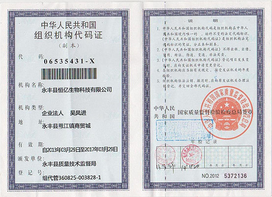 | 公司名稱:永豐縣恒億生物科技有限公司 | 公司名稱:江西康夫康生物科技有限公司 | ||||||||||||||||||||
