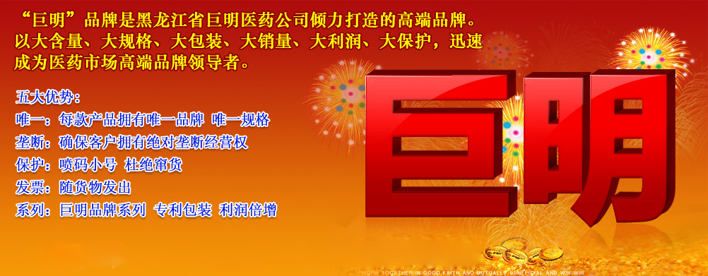 黑龍江省巨明醫(yī)藥有限公司產(chǎn)品展臺(tái) 技術(shù)支持: 環(huán)球醫(yī)藥招商網(wǎng) (招商頻道-醫(yī)藥代理-otc-處方藥) 版權(quán)所有,違版必究