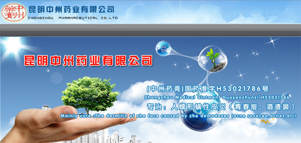 昆明中州藥業(yè)有限公司(原云南中州制藥有限公司)位于中國昆明市經濟技術開發(fā)區(qū)經東路16號,是擁有自主知識產權的GMP制藥企業(yè),生產中華人民共和國發(fā)明專利藥品:《中州藥膏》通用名稱:氧化鋅升華硫軟膏。發(fā)明專利號:ZL-200510048633.0。是PRC創(chuàng)新科技研制具有殺螨、殺菌、消炎、潤膚治療人類蠕形螨性皮炎(青春痘、酒渣鼻)國藥準字H53021786文號,OTC甲類的正規(guī)治療藥品。現(xiàn)已出口歐、美、亞、港、澳、臺等國家和地區(qū)。本公司由PRC研制藥物發(fā)明專利權人趙中州教授擔任董事長、總經理兼制藥總工程師。公司宗旨是堅持醫(yī)學臨床科研與制藥為一體,以質量,信譽至上,發(fā)揚光大中州精神,為患者服務,把中國發(fā)明專利藥品《中州藥膏》奉獻給國內外的朋友們。為保護人類面部皮膚的健美做出貢獻。
