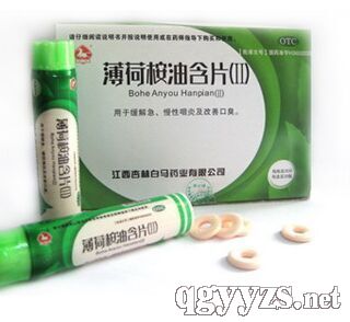 本品為復方制劑,每片含薄荷油0.0007毫升、桉油0.0008毫升、薄荷腦1.0毫克。輔料為葡萄糖、糊精、滑石粉、氯化鈉、檸檬酸、桔子油香精、硬脂酸鎂、檸檬黃、胭脂紅。 |
