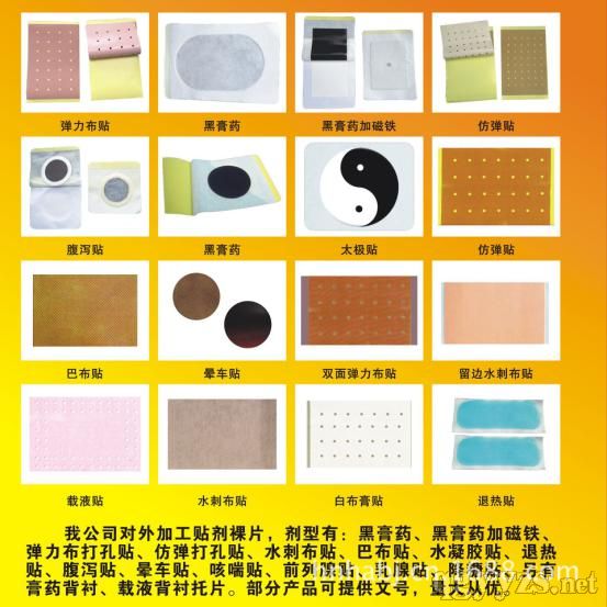 傳統(tǒng)黑膏藥、現(xiàn)代加膠黑膏藥、松香黑膏藥、巴布貼、油膠貼、遠(yuǎn)紅外磁療貼、遠(yuǎn)紅外理療貼、灸熱治療貼、暖宮貼、痛經(jīng)貼、前列腺貼、乳腺貼、養(yǎng)元貼、減肥貼、暈車貼、戒煙貼、雞眼貼、肚臍貼、穴位貼敷治療貼、磁灸熱貼、隔物灸、熱奄包、三伏貼、三九貼、沙蒿子透皮貼、藥物控釋棉透皮貼、無菌敷貼、咳喘貼、腹瀉貼、感冒貼、鼻炎貼、咽炎貼、積食貼、便秘貼、發(fā)熱貼、退熱貼、輸液加溫貼、足貼、蒸汽眼罩、冷療貼、醫(yī)用冷敷貼、等數(shù)百個品種,都可以在膏藥批發(fā)基地采購到。
