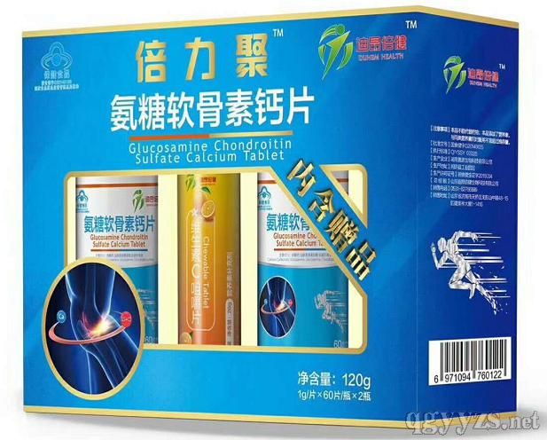 | 倍力聚 | 每100g含:鈣11.3g,鹽酸氨基葡糖糖20g, 硫酸軟骨素20g | 碳酸鈣、鹽酸氨基葡糖糖、硫酸軟骨素、酪蛋白磷酸肽、甜菊糖苷、淀粉、硬脂酸鎂 |