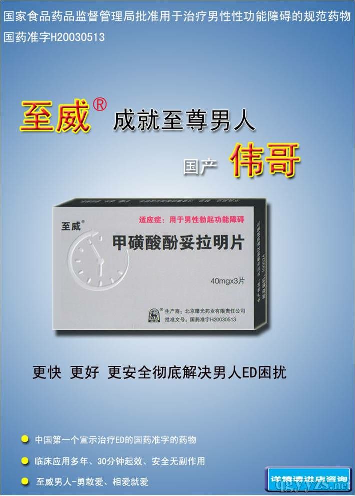 甲磺酸酚妥拉明片(至威)是一款國藥準(zhǔn)字的壯陽、補(bǔ)腎速效偉哥。速效偉哥就是快速治療“痿哥”,快速治療“痿哥”的就是速效偉哥,沒毛!