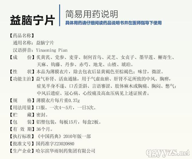 本方扶正補(bǔ)腎、填精補(bǔ)腦、平肝潛陽、化痰降濁、活血化瘀、通達(dá)腦脈、虛實(shí)相兼、標(biāo)本兼顧、諸藥配伍,共奏補(bǔ)腎益腦、活血通緒之功效。主要用于腦動(dòng)脈硬化癥、中風(fēng)后遺癥及冠心病、心絞痛、高血壓等脾腎不足、血脈瘀阻者。經(jīng)3000多例患者臨床驗(yàn)證,總有效率90.4%,屬國家中藥保護(hù)品種。