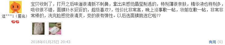 淘友木***6:面膜收到了,使用后才來(lái)評(píng)論,補(bǔ)水效果特別好,棒棒噠,還會(huì)繼續(xù)光顧的!