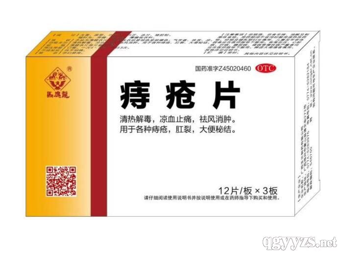 馬應龍痔瘡片(國藥準字z45020460)主要成分是大黃、功勞木、蒺藜、白芷、冰片、豬膽汁。具有清熱解毒,涼血止痛,祛風消腫?捎糜谥摊,肛裂,大便秘結(jié)。