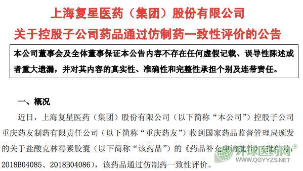 11月21日,復(fù)星醫(yī)藥發(fā)布公告稱,其控股子公司重慶藥友制藥的鹽酸克林霉素膠囊(規(guī)格:按 C18H33ClN2O5S 計(jì) 75mg、150mg)通過(guò)仿制藥一致性評(píng)價(jià)。