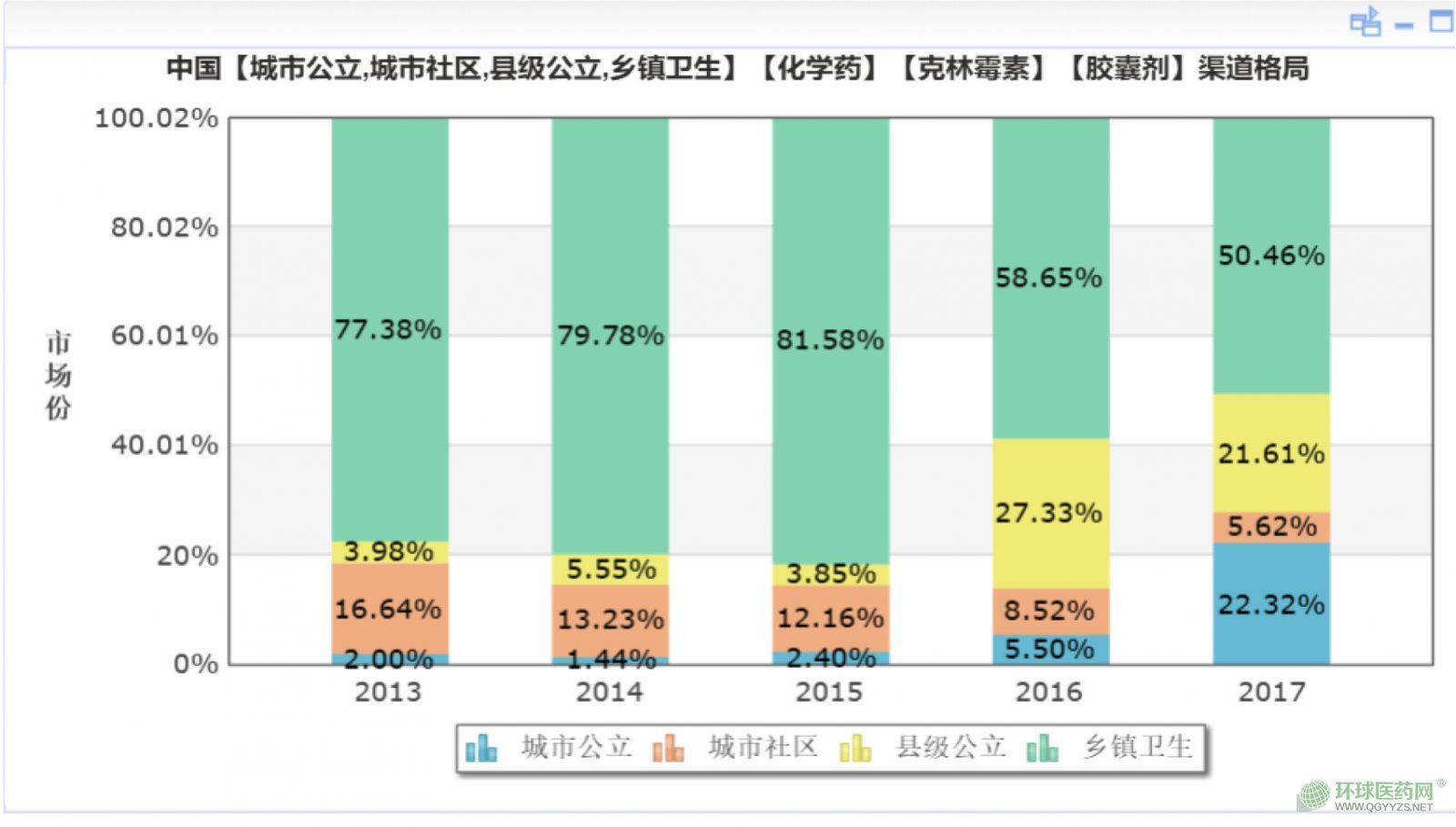 從鹽酸克林霉素膠囊近年來(lái)在各級(jí)醫(yī)院使用的情況看,其在基層醫(yī)療機(jī)構(gòu)的市場(chǎng)占比越來(lái)越大小,而縣級(jí)和城市公立醫(yī)院的市場(chǎng)越來(lái)越大?梢,在限抗令的政策下,抗生素在基層濫用的情況逐步得到改善。