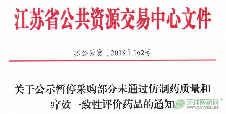 11月22日,江蘇省公共資源交易中心發(fā)布《關(guān)于公示暫停采購(gòu)部分未通過(guò)仿制藥質(zhì)量和療效一致性評(píng)價(jià)藥品的通知》。