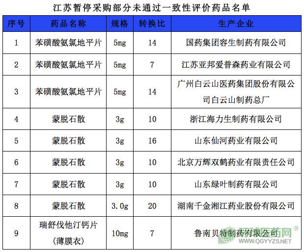 這是江蘇省首次發(fā)布通知暫停采購(gòu)未過(guò)一致性評(píng)價(jià)藥品。根據(jù)通知,有9個(gè)藥品被暫停采購(gòu),共涉及9家藥企。具體名單如下: