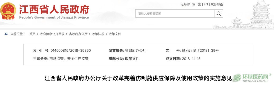 就在11月21日,江西省人民政府官網(wǎng)發(fā)布《江西省人民政府辦公廳關(guān)于改革完善仿制藥供應(yīng)保障及使用政策的實(shí)施意見》。