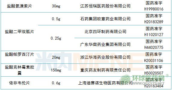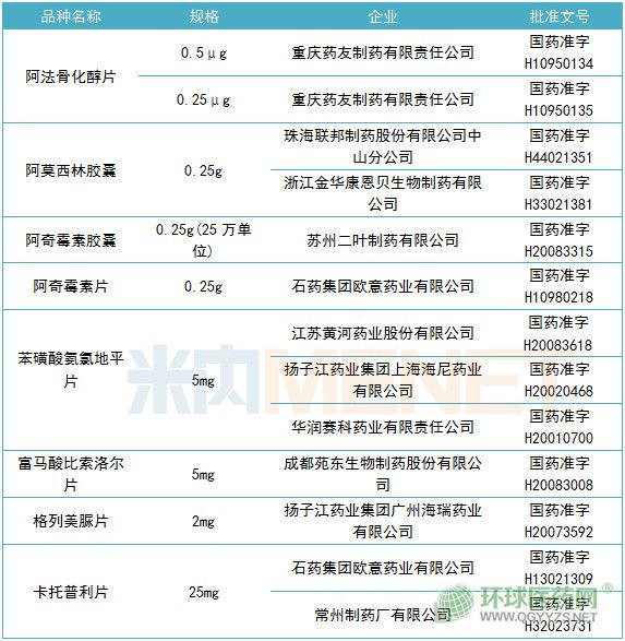 復(fù)星醫(yī)藥(含2家子公司)有4個(gè),包括了:江蘇黃河藥業(yè)股份有限公司的苯磺酸氨氯地平片(5mg)、重慶藥友制藥有限責(zé)任公司的阿法骨化醇片(0.25μg、0.5μg)、鹽酸克林霉素膠囊(150mg)。