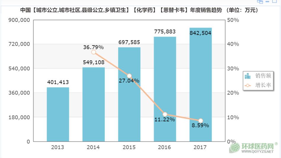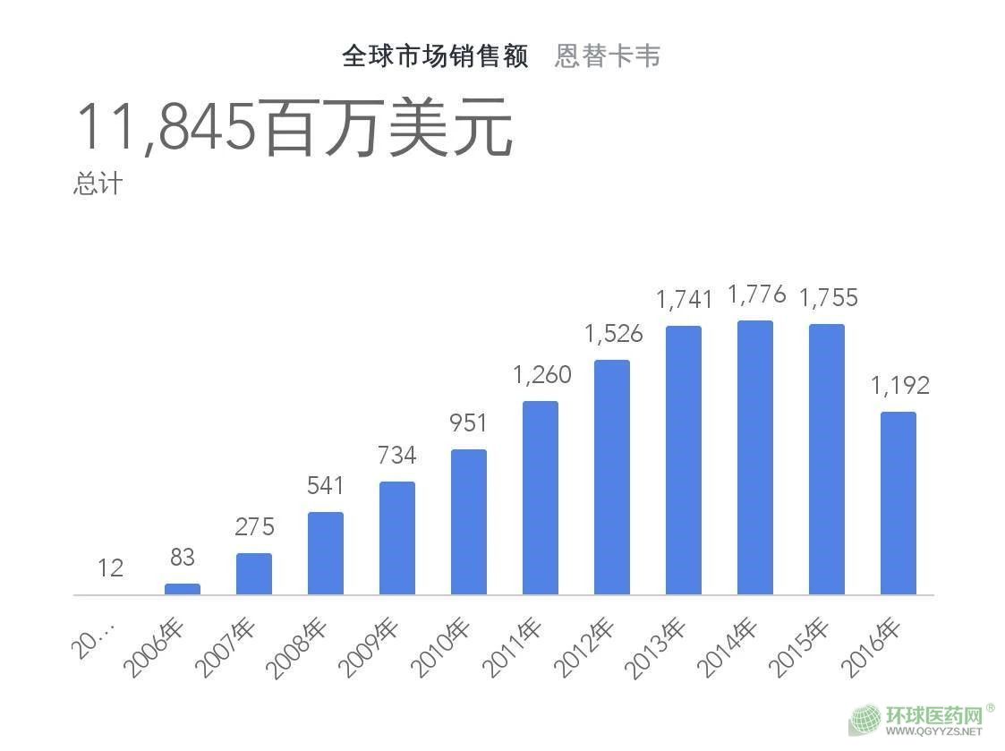 《藥篩》數(shù)據(jù)顯示,恩替卡韋全球市場年銷售最高達(dá)到17.8億美元(共計人民幣123.8億元),2015年后,由于仿制藥、其他新藥加入,市場銷售額開始下降。