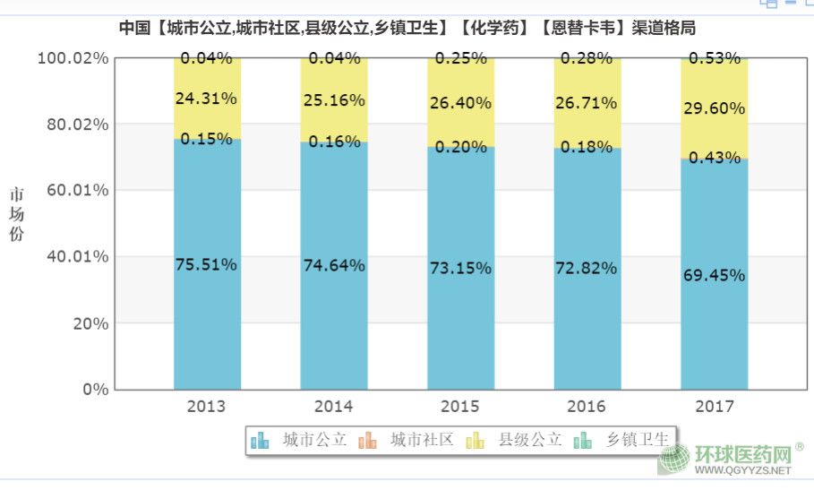 從恩替卡韋在各級醫(yī)院使用情況來看,其在縣級公立醫(yī)院的市場占比逐漸增大?梢姡诜旨壴\療政策下,作為慢性乙型肝炎治療的一線藥物,其市場已經(jīng)逐漸往基層下沉。