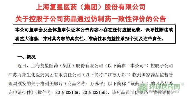 1月25日晚間,復(fù)星醫(yī)藥發(fā)布公告稱,其控股子公司江蘇萬(wàn)邦生化醫(yī)藥集團(tuán)有限責(zé)任公司收到國(guó)家藥品監(jiān)督管理局頒發(fā)的關(guān)于格列美脲片(1mg、2mg),該藥品通過仿制藥一致性評(píng)價(jià)。