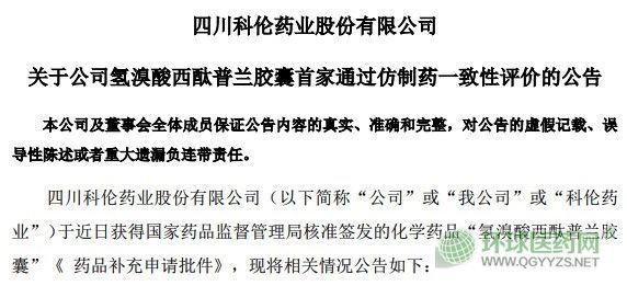 1月24日晚間,科倫藥業(yè)發(fā)布公告稱,科倫藥業(yè)生產(chǎn)的氫溴酸西酞普蘭膠囊(20mg)通過仿制藥質(zhì)量和療效一致性評(píng)價(jià)。
