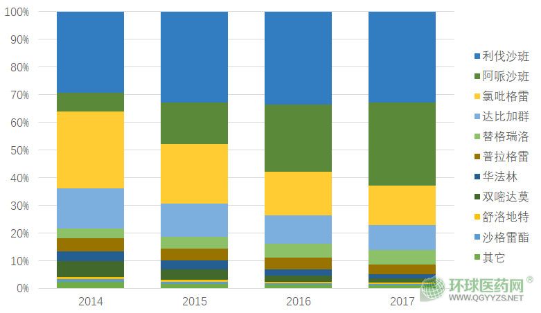 根據(jù)PBD數(shù)據(jù)庫(kù),在全球上市的口服抗凝藥中,沙班類表現(xiàn)相當(dāng)強(qiáng)勢(shì)。自2014年開始,氯吡格雷市場(chǎng)份額持續(xù)走低,而沙班類逐漸占據(jù)主導(dǎo)地位,位列市場(chǎng)份額第一、第二的分別是利伐沙班、阿哌沙班。