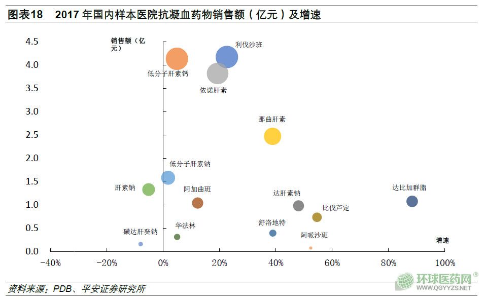 同全球市場(chǎng)相比,口服院抗凝藥在中國(guó)市場(chǎng)的表現(xiàn)稍有不同。據(jù)平安證券分析,2016年阿哌沙班在中國(guó)市場(chǎng)銷售額僅為0.61億元。2017年樣本醫(yī)院抗凝藥物銷售占比前五的分別是利伐沙班、低分子肝素鈣、依諾肝素、那曲肝素和低分子肝素鈉。