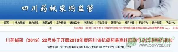1月29日,四川省藥械集中采購(gòu)服務(wù)中心發(fā)布《關(guān)于開展2019年度四川省抗癌藥最高掛網(wǎng)限價(jià)動(dòng)態(tài)調(diào)整的通知》。