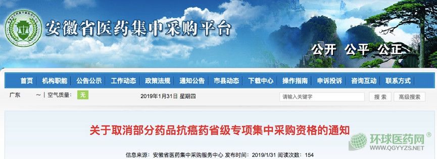 1月31日,安徽省醫(yī)藥集中采購平臺發(fā)布通知,取消部分藥品抗癌藥升級專項集中采購資格。