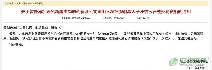 通知顯示,根據(jù)廣東省藥品監(jiān)督管理局發(fā)布的《收回藥品GMP證書公告》,及廣東省藥品集中采購工作有關(guān)規(guī)定,通過核查、公示等程序,決定即日起暫停深圳未名新鵬生物醫(yī)藥有限公司生產(chǎn)的重組人粒細胞刺激因子注射液(規(guī)格:0.5ml:0.125mg)在線交易資格。