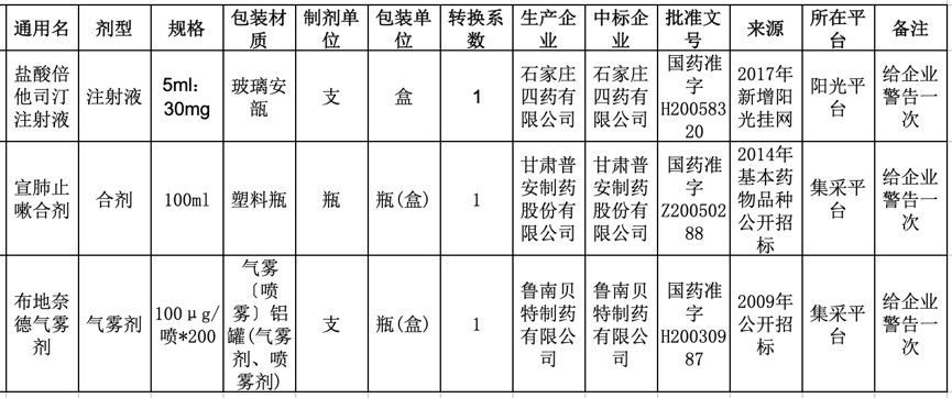 其中,石家莊四藥有限公司的鹽酸倍他司汀注射液、甘肅普安制藥的宣肺止嗽合劑和魯南貝特制藥的布地奈德氣霧劑被暫停或撤銷中標掛網(wǎng)。