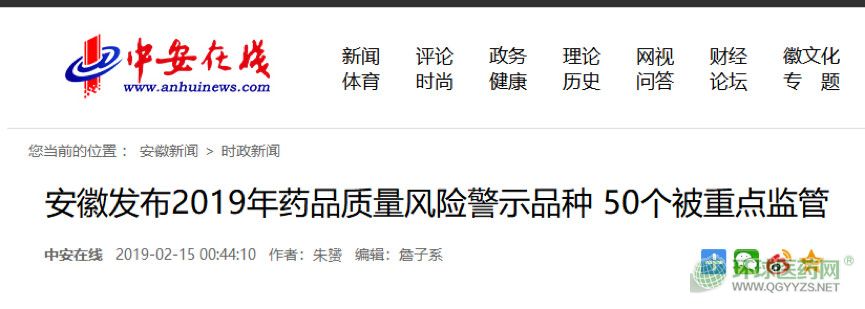 2月15日,安徽省重點新聞門戶網(wǎng)站中安在線發(fā)布消息:安徽省藥品監(jiān)管局發(fā)布2019年藥品質(zhì)量風險警示品種,50個藥品將被重點監(jiān)管。