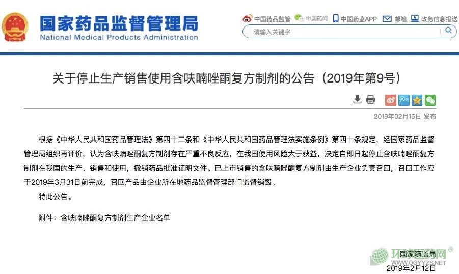 已上市銷售的含呋喃唑酮復方制劑由生產(chǎn)企業(yè)負責召回,召回工作應(yīng)于2019年3月31日前完成,召回產(chǎn)品由企業(yè)所在地藥品監(jiān)督管理部門監(jiān)督銷毀。