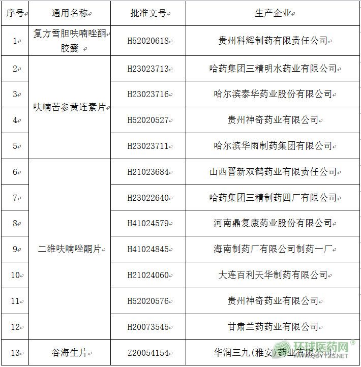 從公告附件可以看到,含呋喃唑酮的復方制劑共4個,分別是復方雪膽呋喃唑酮膠囊、呋喃苦參黃連素片、二維呋喃唑酮片、谷海生片,涉及13家藥企,如哈藥、華潤三九等。