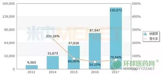 近幾年來,磷酸奧司他韋在中國公立醫(yī)療機構(gòu)終端的銷售額增長迅猛,2013年銷售額不到1億元,2017年銷售額已達15億元,5年時間銷售額增長15倍。