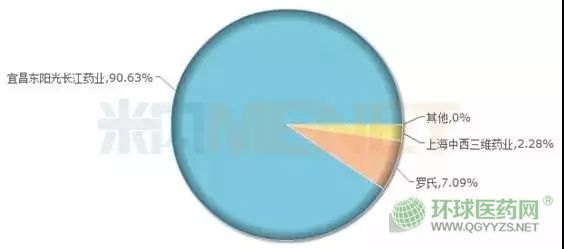 從2017年中國公立醫(yī)療機構(gòu)終端磷酸奧司他韋競爭格局看,宜昌東陽光長江藥業(yè)的可威以90.63%的市場份額遙遙領(lǐng)先。