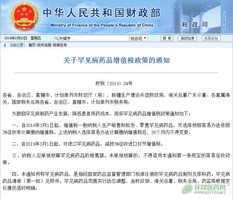 2月22日,財政部網站發(fā)布了《關于罕見病藥品增值稅政策的通知》。通知明確了第一批罕見病藥品清單,涉及波生坦、安立生坦、利奧西呱、馬西騰坦等21個罕見病藥品制劑,以及波生坦、吡非尼酮、青霉胺、利魯唑4個罕見病藥品原料藥。