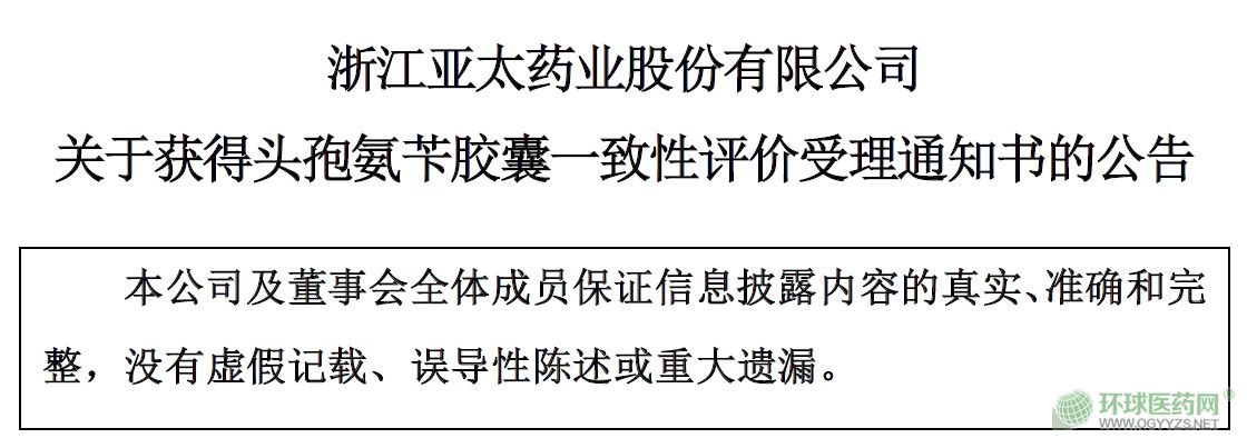 2月25日,浙江亞太藥業(yè)股份有限公司發(fā)布《關(guān)于獲得頭孢氨芐膠囊一致性評價受理通知書的公告》。浙江亞太藥業(yè)表示,近日收到國家藥品監(jiān)督管理局下發(fā)的關(guān)于頭孢氨芐膠囊一致性評價的受理通知書。