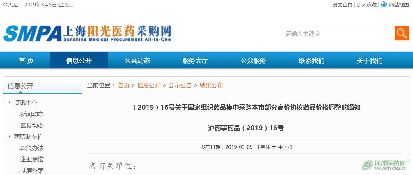 3月5日,上海陽光醫(yī)藥采購網(wǎng)發(fā)布《(2019)16號(hào)關(guān)于國家組織藥品集中采購本市部分高價(jià)協(xié)議藥品價(jià)格調(diào)整的通知》(以下簡稱《通知》)。