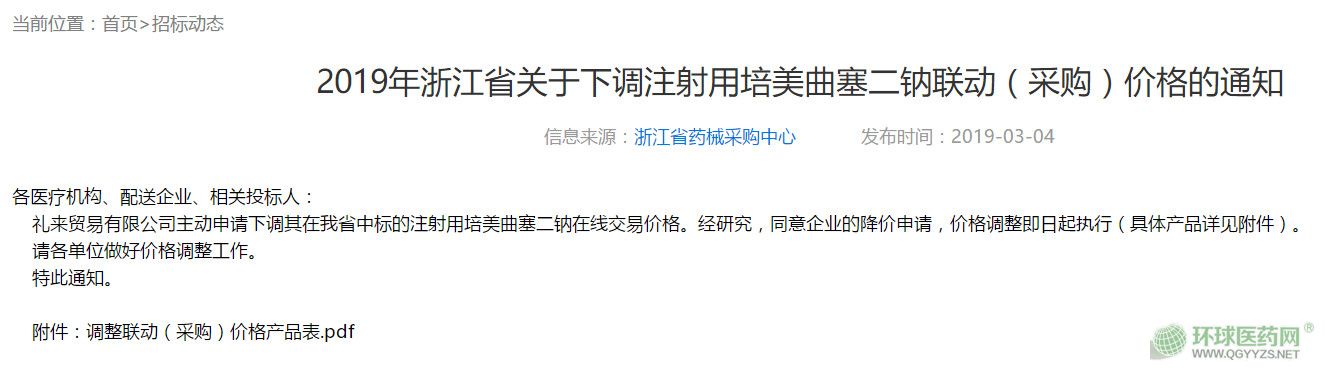 3月4日,浙江省藥械采購中心發(fā)布通知,下調(diào)禮來注射用培美曲塞二鈉聯(lián)動(dòng)(采購)價(jià)格,在國家組織的4+7帶量采購中,注射用培美曲塞二鈉由四川匯宇制藥中標(biāo)。