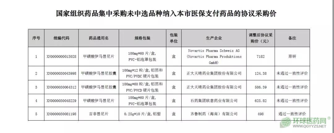 從附件可以看到,諾華的原研藥甲磺酸伊馬替尼(100mg*60片)價(jià)格降到了7182元,此外正大天晴、石藥歐意集團(tuán)未過一致性評(píng)價(jià)的甲磺酸伊馬替尼也不同程度的調(diào)低了價(jià)格。