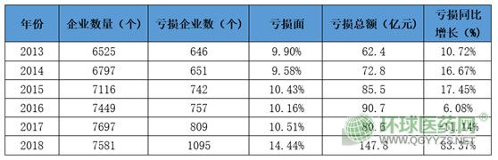 從2013年截至2018年12月底,我國(guó)醫(yī)藥行業(yè)規(guī)模以上企業(yè)數(shù)量總體呈現(xiàn)增加趨勢(shì),達(dá)到7581家,但與2017年相比數(shù)量有所下降。其中,虧損企業(yè)數(shù)量1095家,近六年來首次突破1000家企業(yè)虧損。從虧損面看,虧損面14.44%,達(dá)到近幾年的新高。