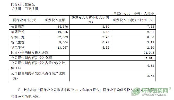 2017年年報(bào)數(shù)據(jù)顯示通化東寶2017年研發(fā)費(fèi)用合計(jì)11911萬(wàn)元,與長(zhǎng)春高新、哈藥股份、華潤(rùn)三九、智飛生物、華蘭生物5家企業(yè)相比,僅高于研發(fā)投入9364萬(wàn)元的智飛生物。