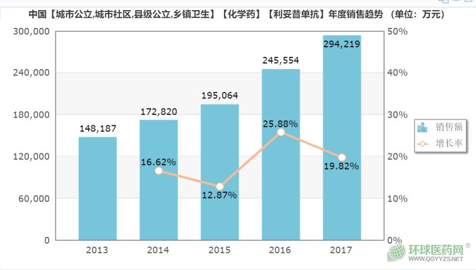 美羅華由羅氏銷售,2017年全球銷售額為79億美元,其中美國市場銷售額44.1億美元,該藥美國市場專利保護截止日期為2018年年中至年底。